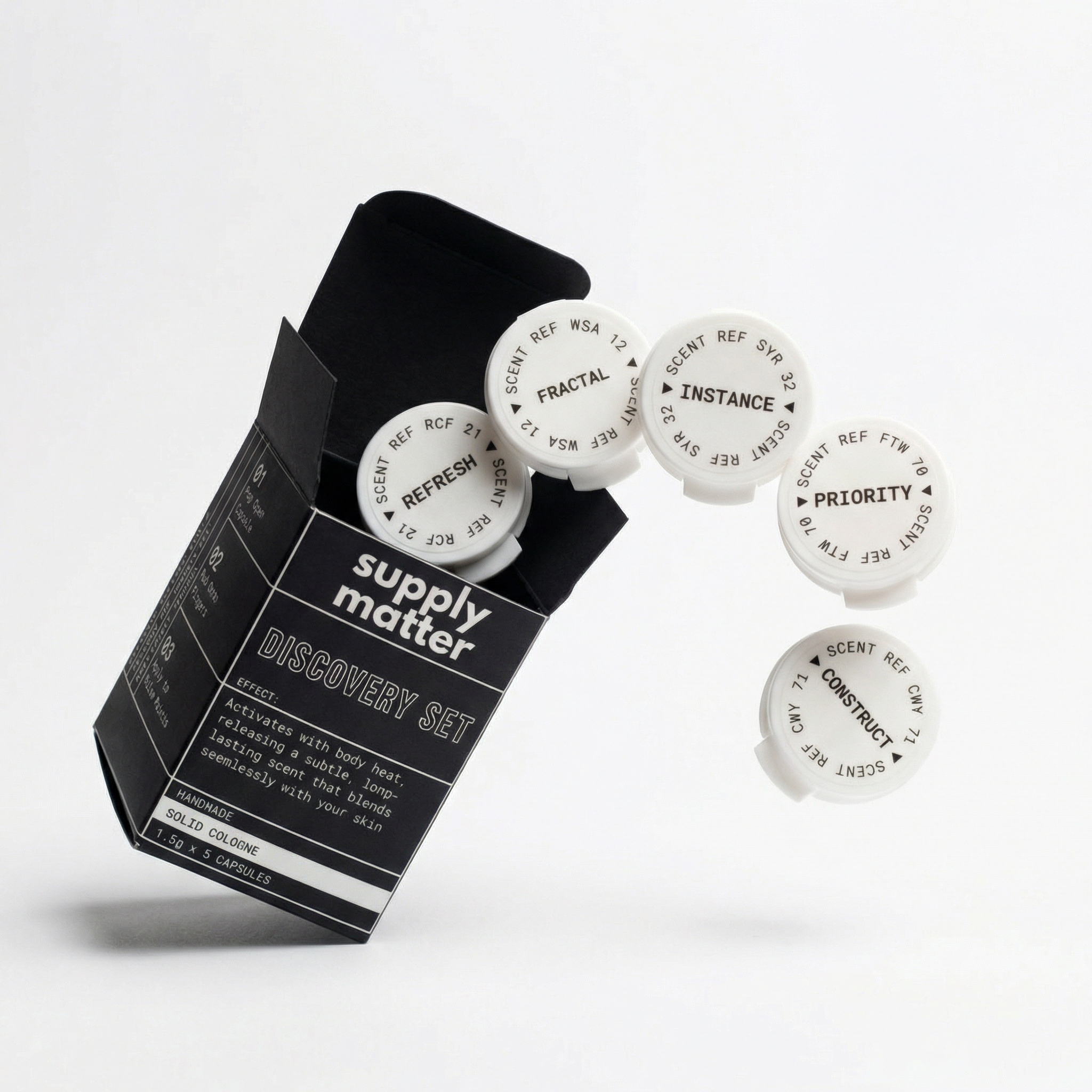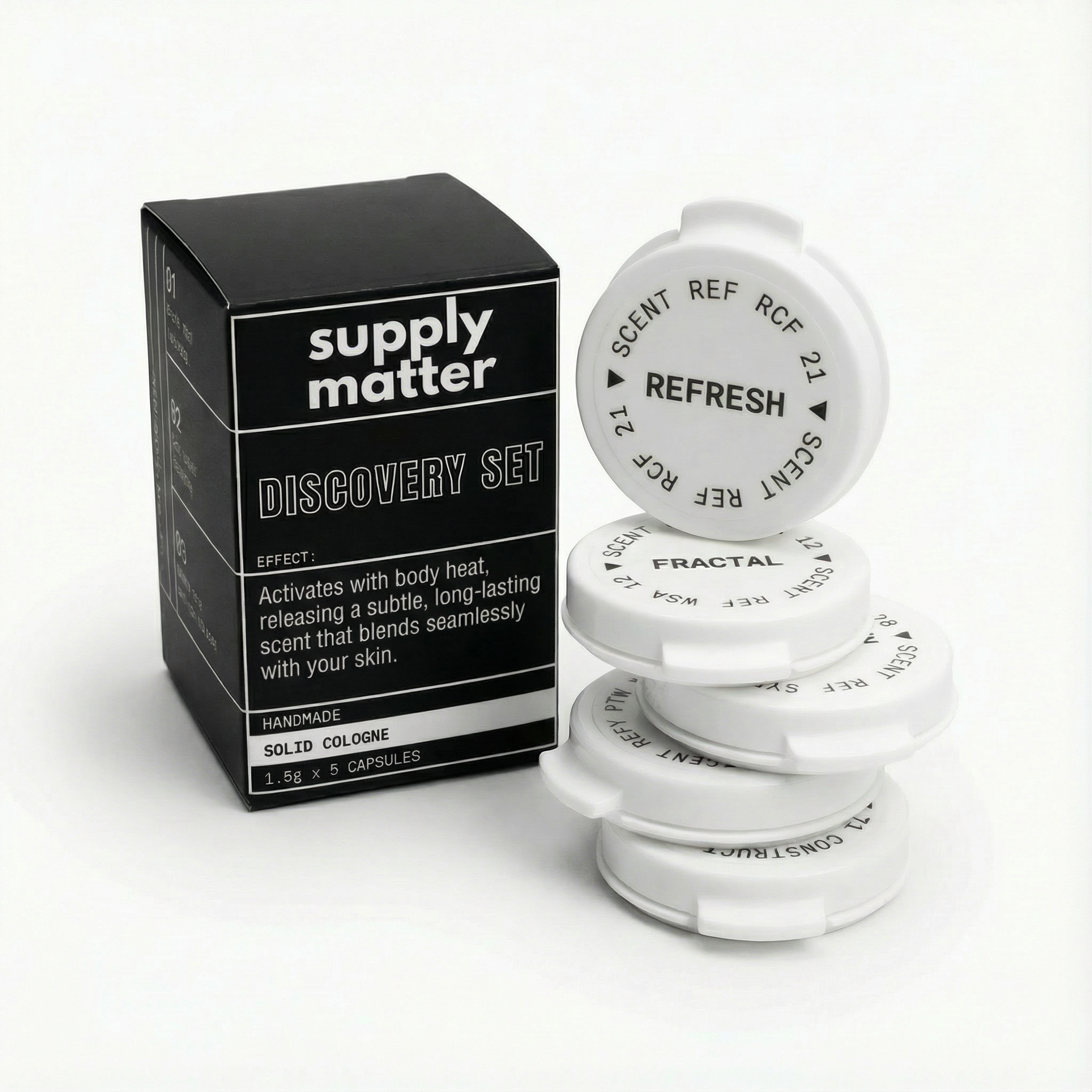 You receive one solid cologne sample from each of our five core scent families, so you can experience the full range before committing to a full size.